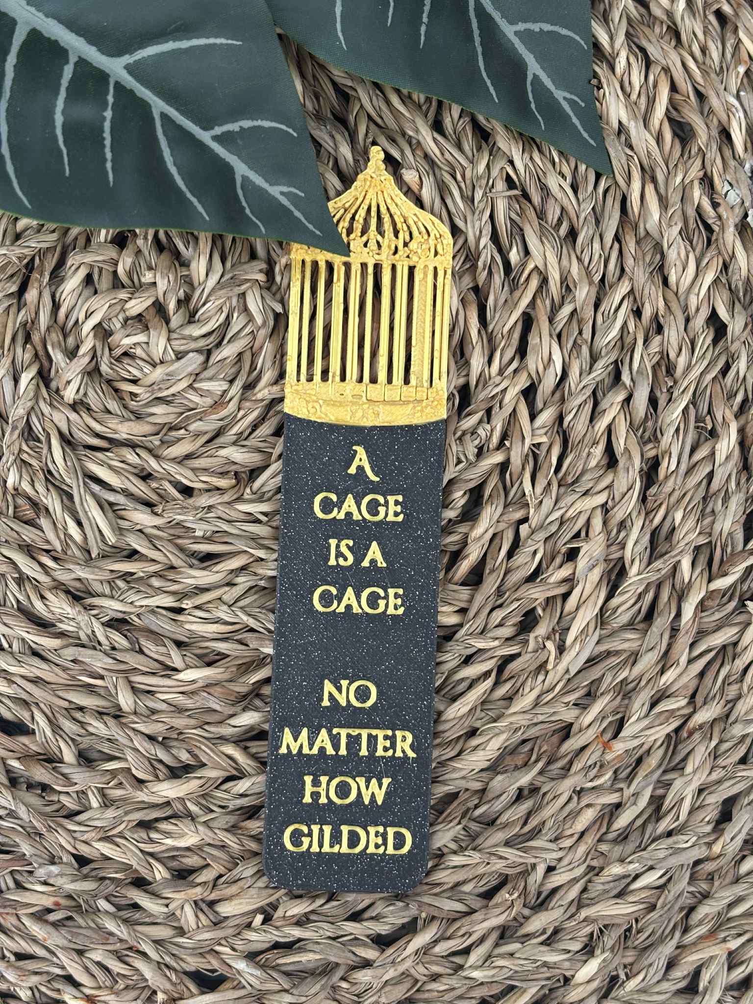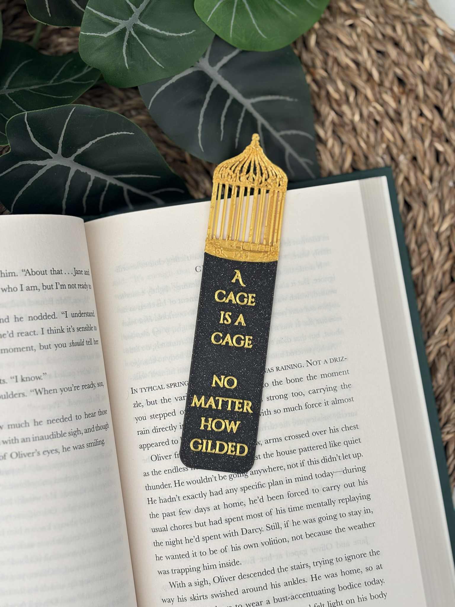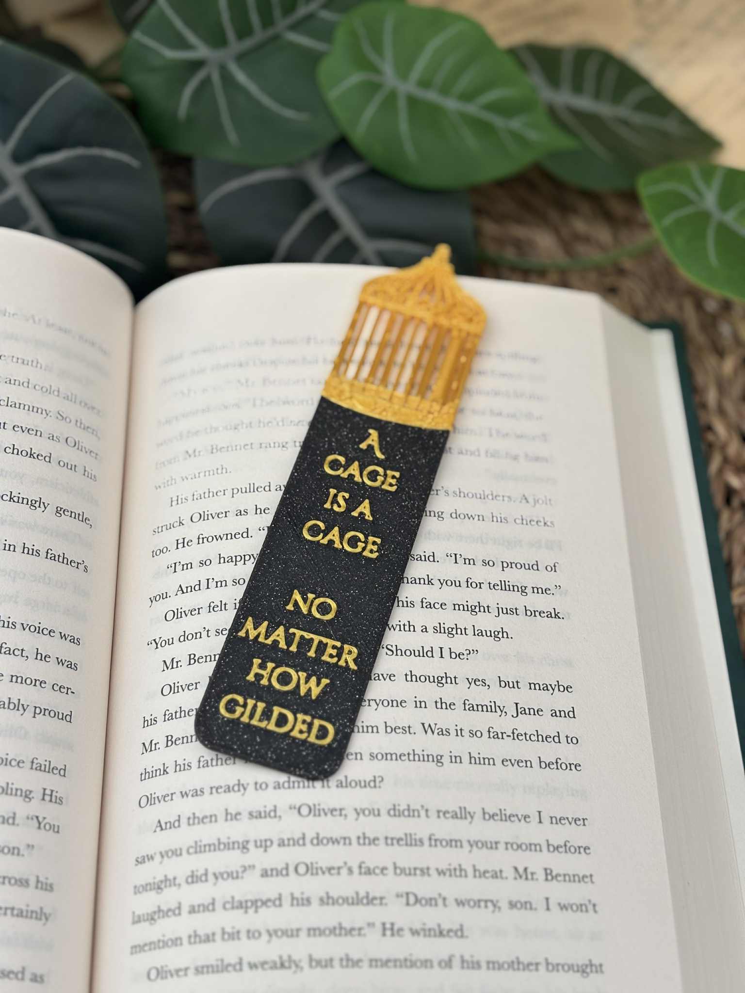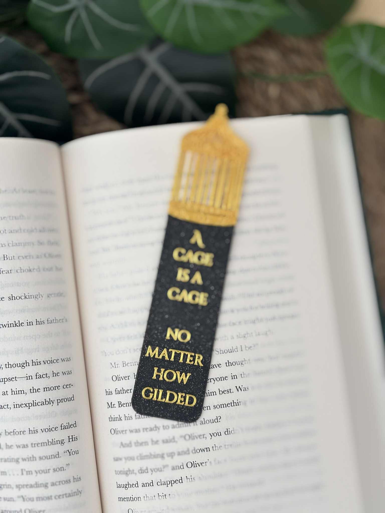 Designet med en gullfarget bur-topp og strukturert svart kropp, gir bokmerket en perfekt blanding av fantasy, estetikk og bokkjærlighet.