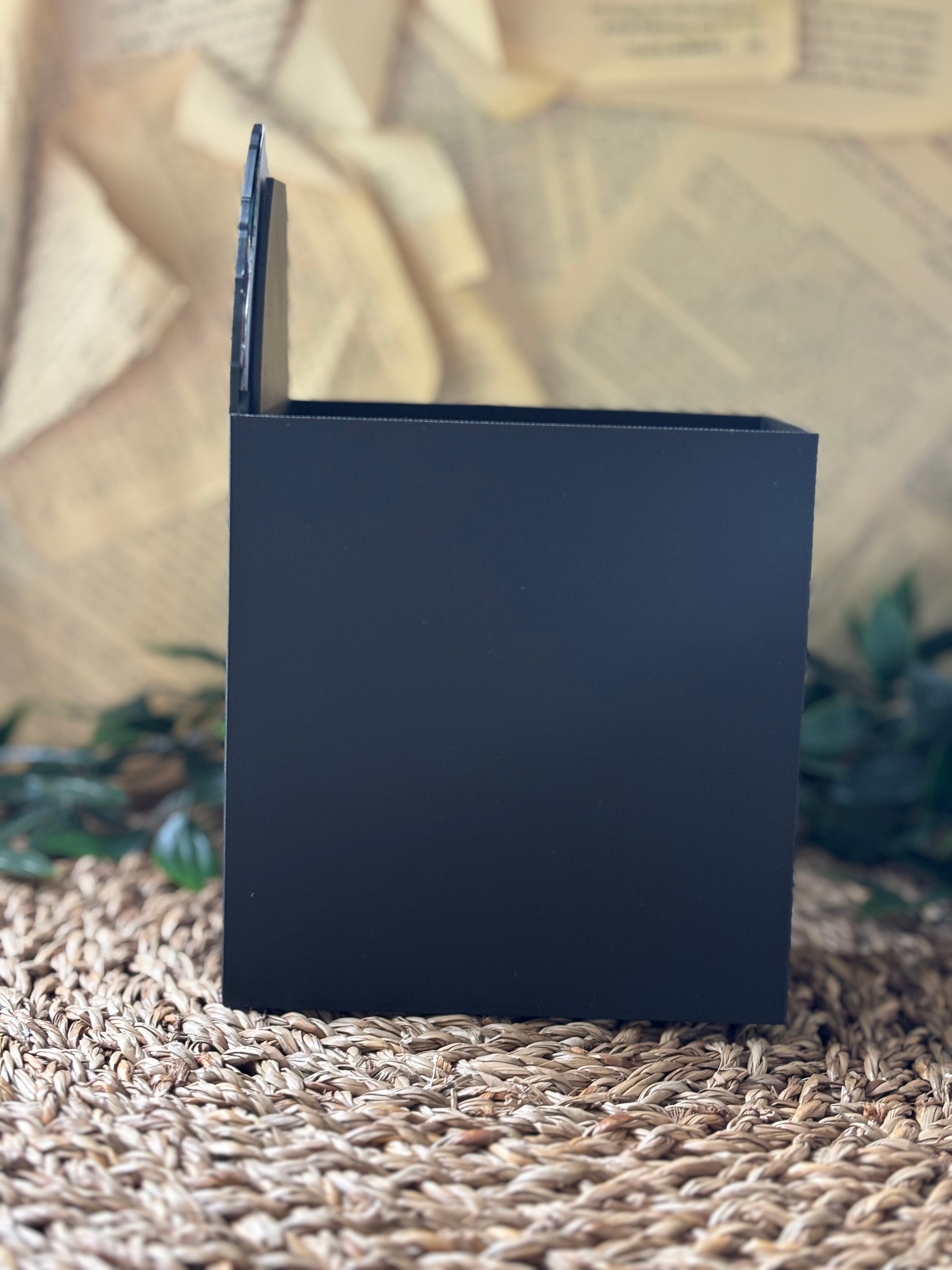 Denne unike oppbevaringsboksen er 3D-printet i Norge og designet for å være både praktisk og dekorativ. Fronten er inspirert av gotiske vinduer og leveres med 5 ulike utskiftbare vindusdesign, slik at du enkelt kan tilpasse uttrykket etter humør, sesong eller stil.