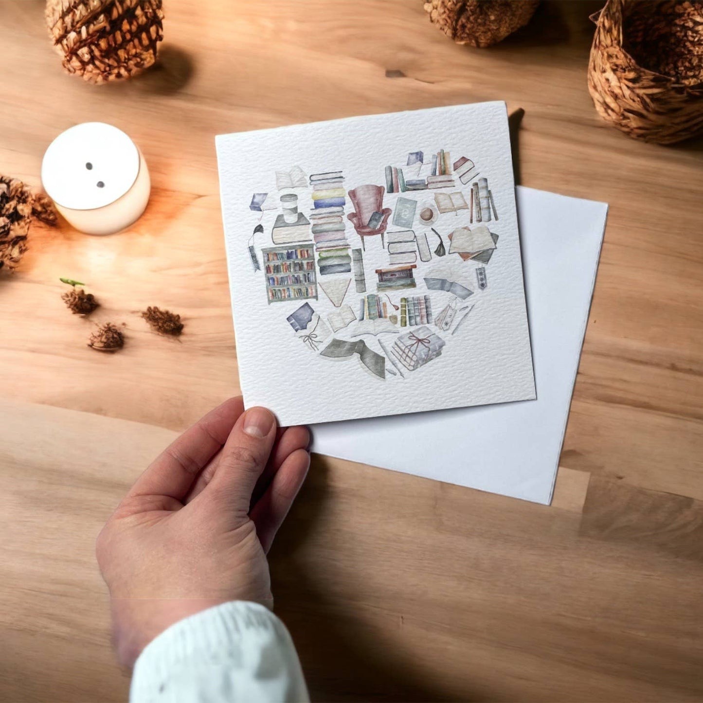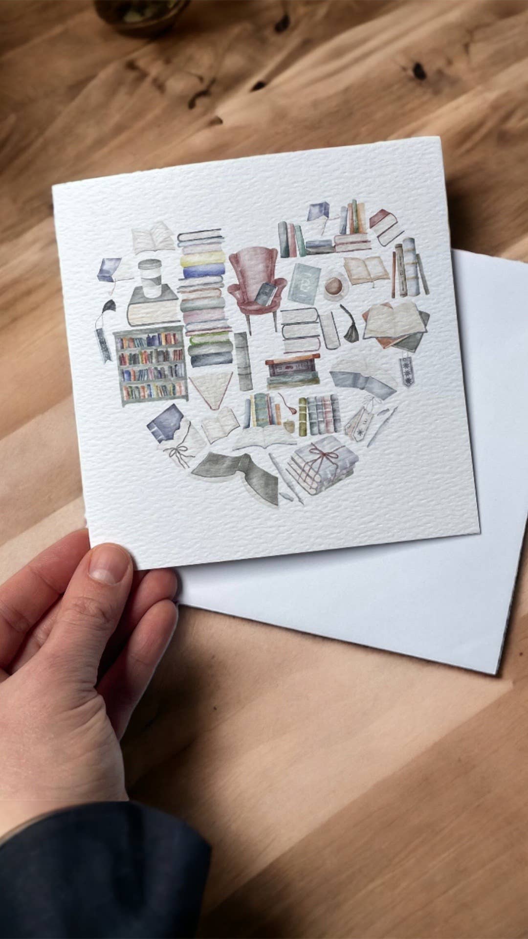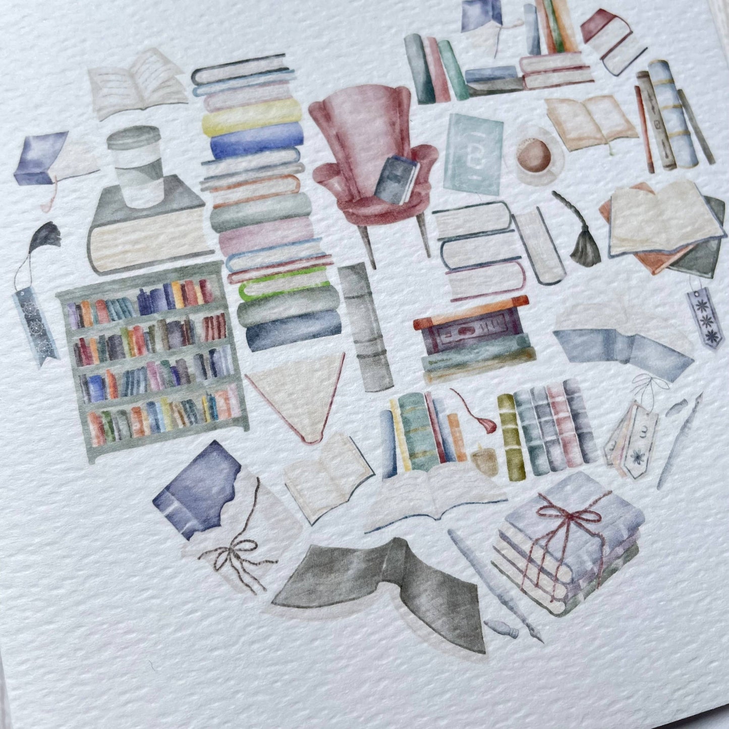 Et vakkert gratulasjonskort med akvarellillustrasjoner av bøker og bokrelaterte produkter alle formet i form av et hjerte for å glede bokelskeren i livet ditt.