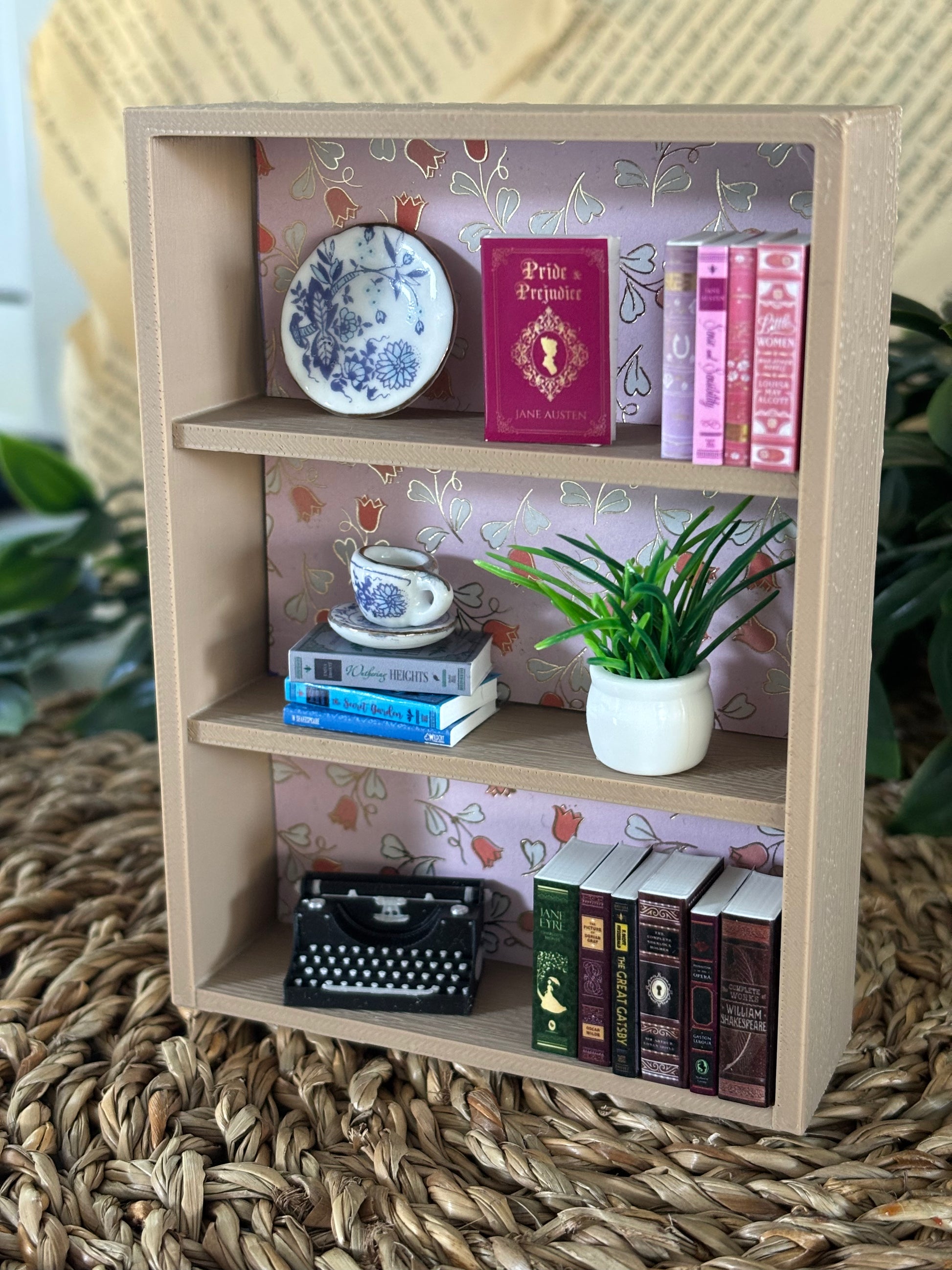 Hyllen er 3D-printet og fylt med håndlagde mini-bøker med omslag inspirert av elskede klassikere.