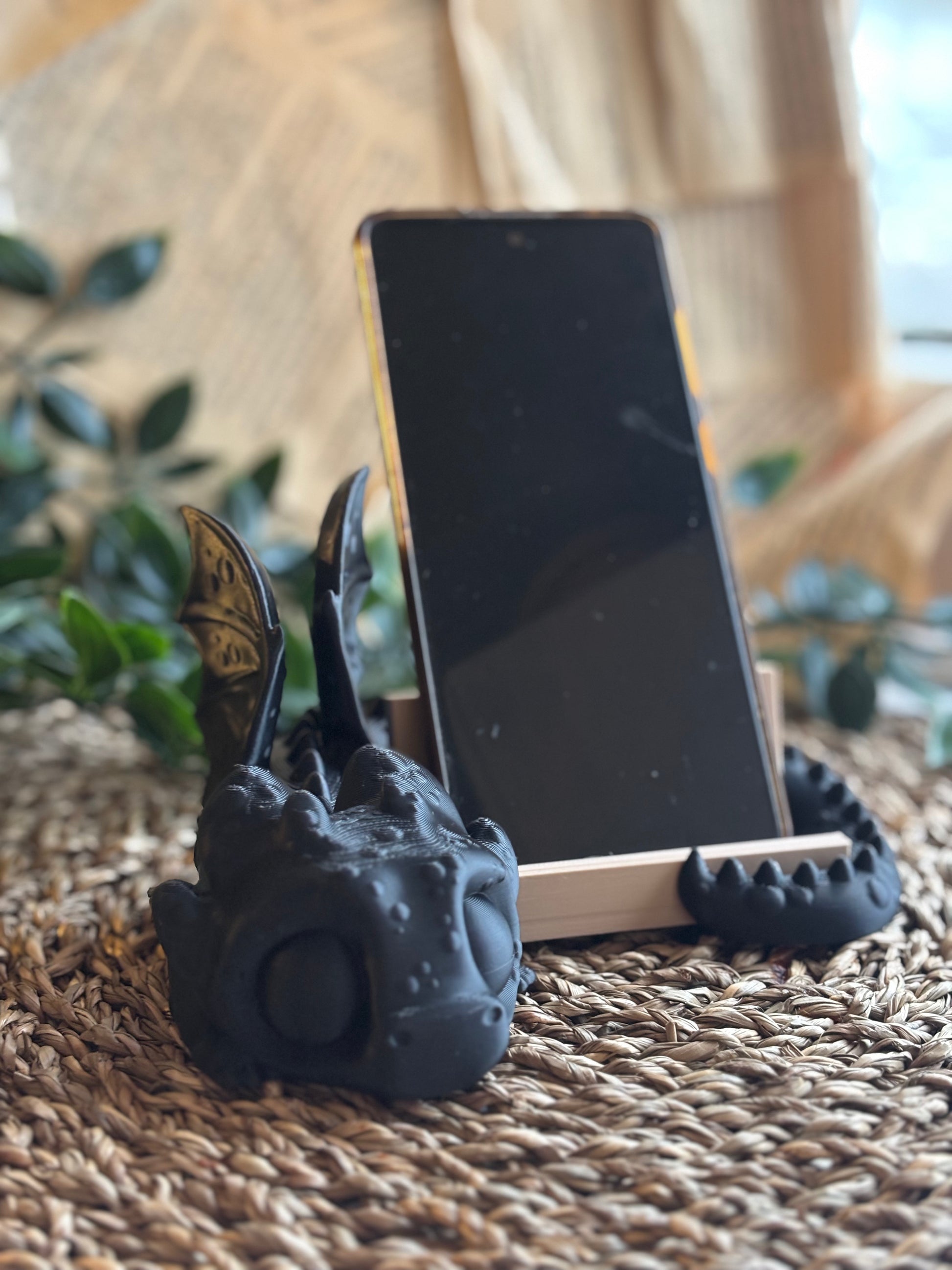 Dragen ligger foran telefonstativet med haledelen som ekstra støtte, noe som gir et helhetlig og dekorativt uttrykk. Den passer like godt til bruk som mobilholder som til ren pynt.