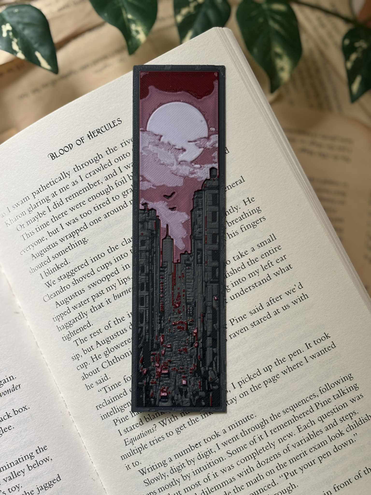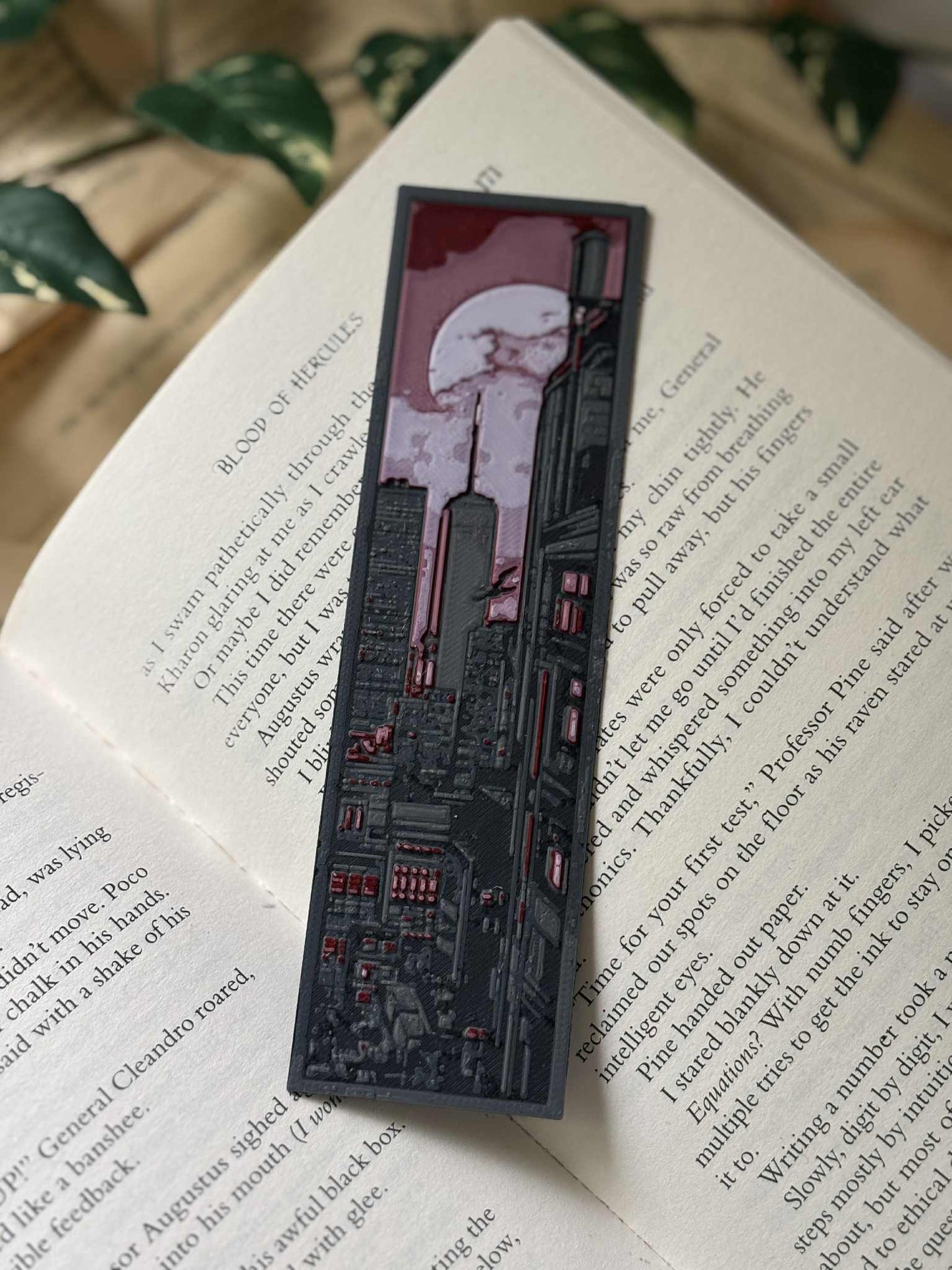 Et moderne og stilfullt sett med tre bokmerker inspirert av lys, bylandskap og futuristiske skyskrapere. Disse 3D-printede bokmerkene passer perfekt til sci-fi, cyberpunk eller deg som elsker storbyens energi mellom boksidene.