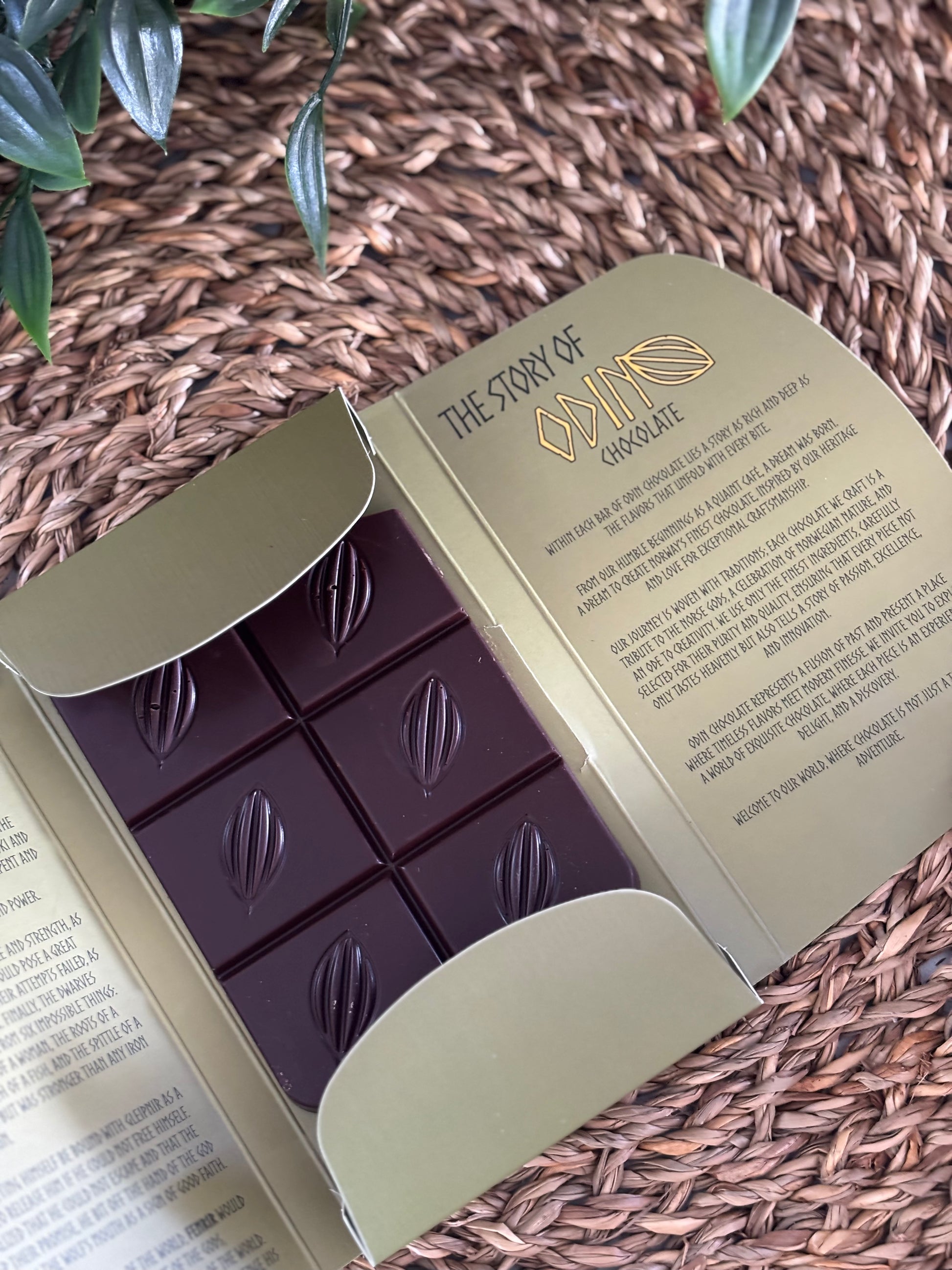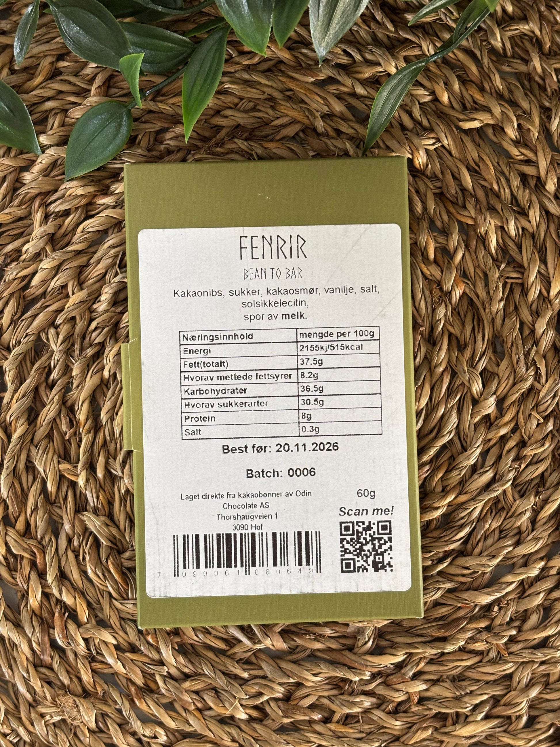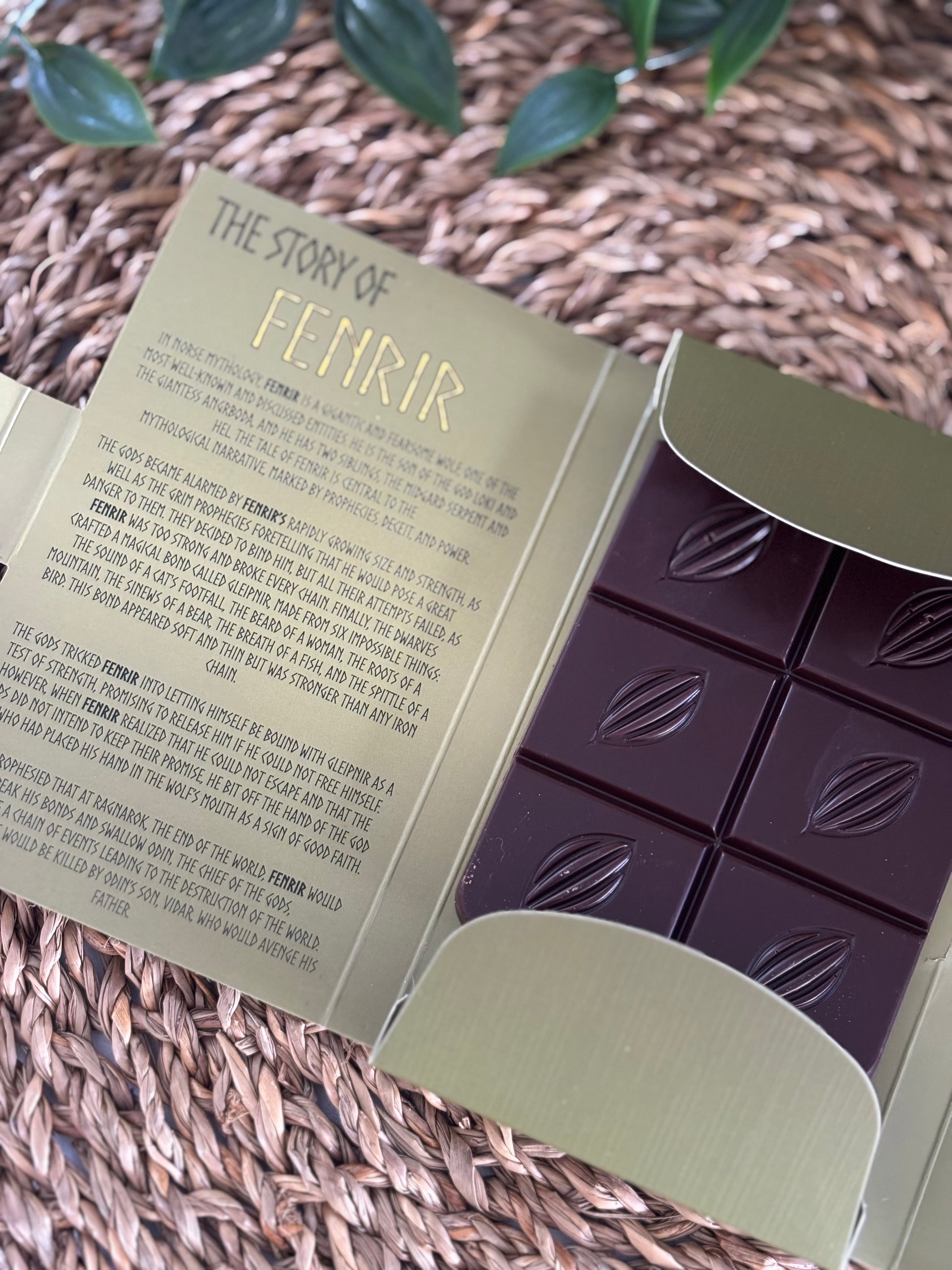 Denne sjokoladen er mer enn bare en godbit for smaksløkene – den er en hyllest til norsk kultur og tradisjonelt sjokoladehåndverk. Emballasjen har et sterkt bilde av Fenrir, ulven fra norrøn mytologi, og inni kan du lese en liten historie om Fenrir og om sjokoladefabrikken.