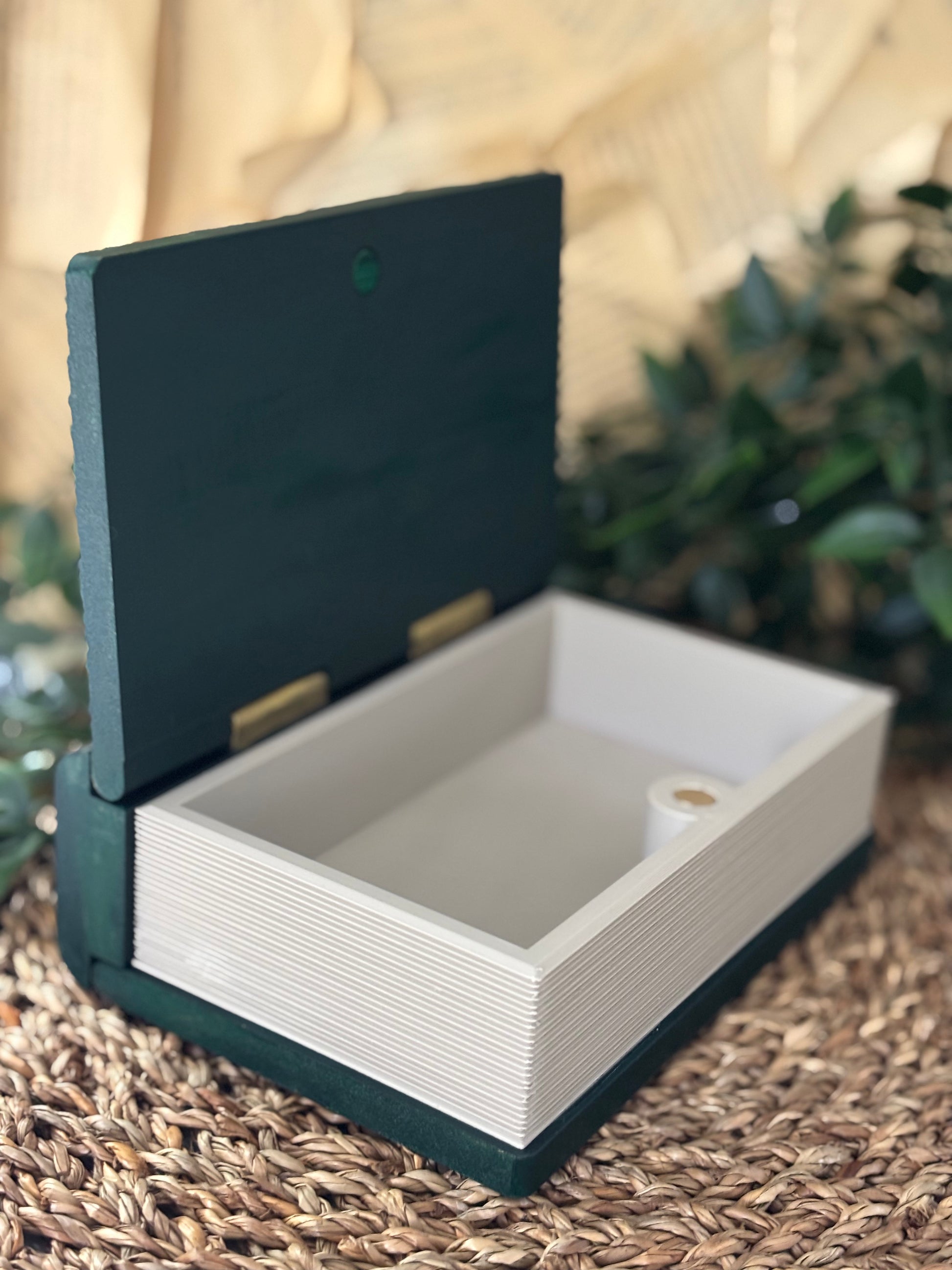 Denne unike oppbevaringsboksen er 3D-printet i Norge og håndmalt med en nydelig dyp grønnfarge og detaljer i gull. Lokket prydes av en majestetisk drage. Perfekt til å oppbevare smykker, tarotkort, bokmerker eller små hemmeligheter.