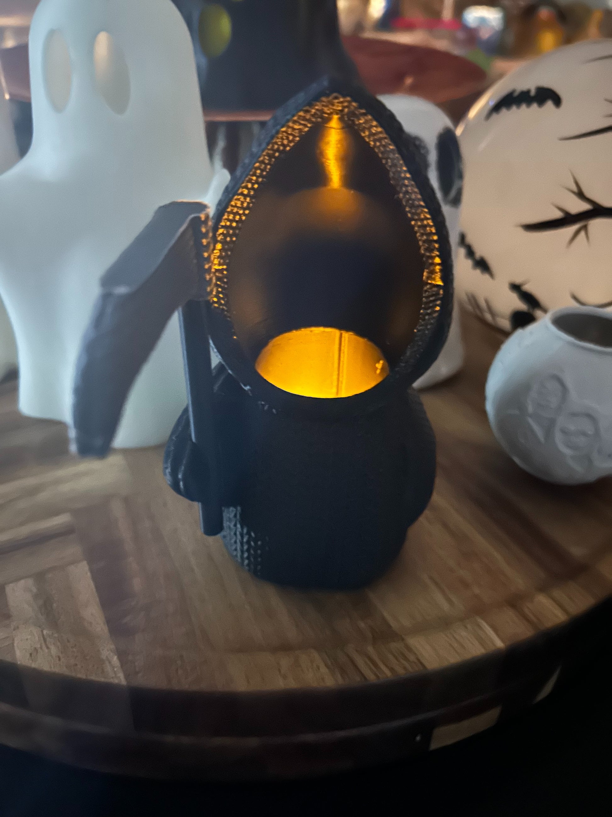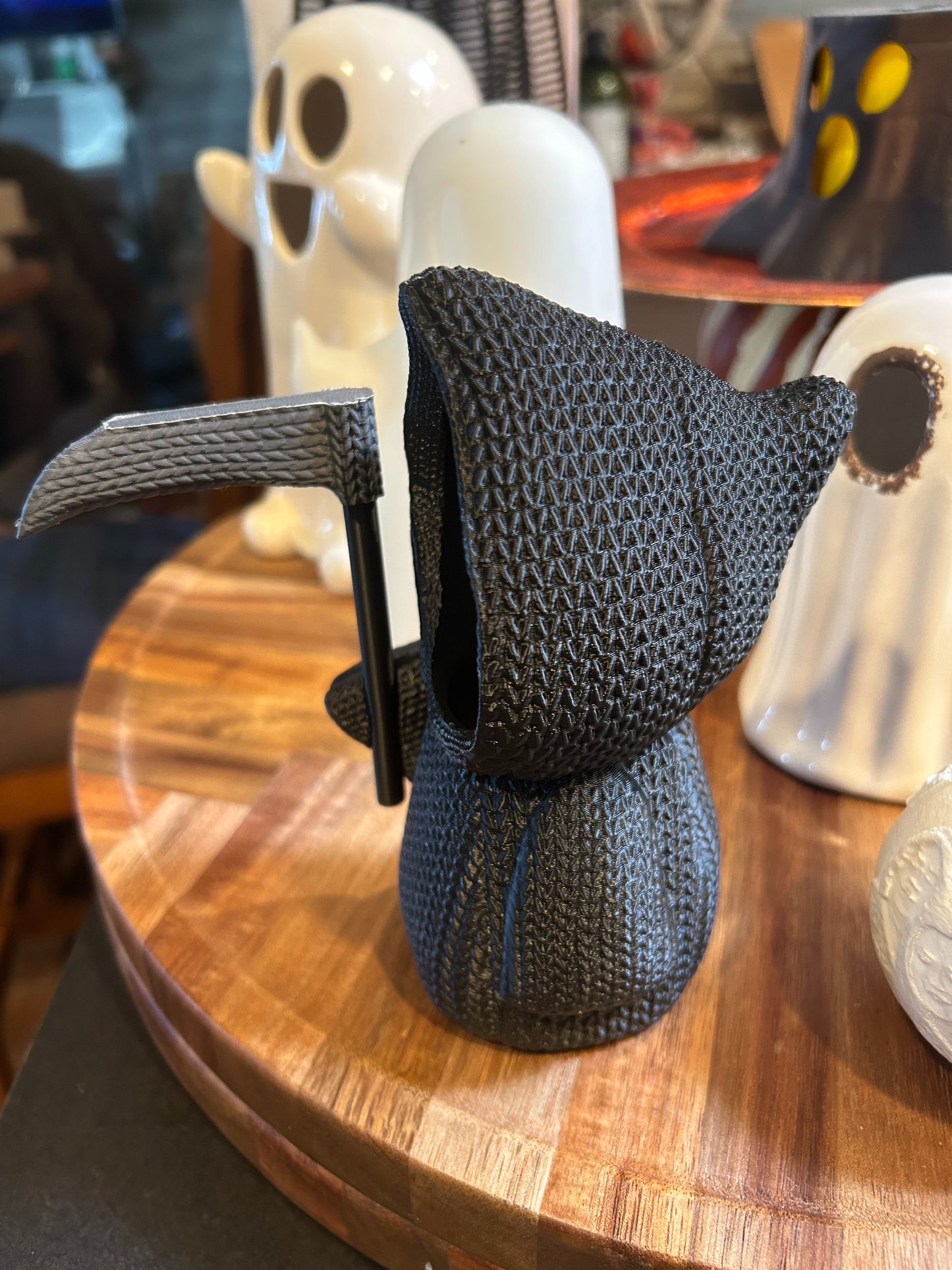 🖤 Designet som en søt og småskummel liten krabat med hette og ljå – akkurat passe uhyggelig til å glede enhver fantasy- og goth-elsker.