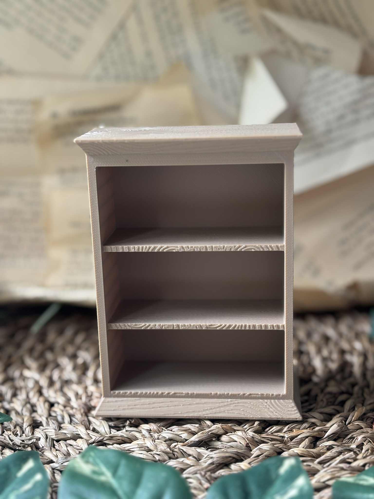 Denne mini bokhylla er 3D-printet for å romme dine små bøker, pynt eller nerde-dekor – perfekt til boknooks, dioramaer eller som et helt unikt gaveelement. Enten du lager mini bøkene selv eller kjøper ferdig bundles av oss er dette den perfekte lille bokhylla! Lag en eksakt kopi av din egen bokhylle, bruk som en TBR eller bare ha den til pynt!