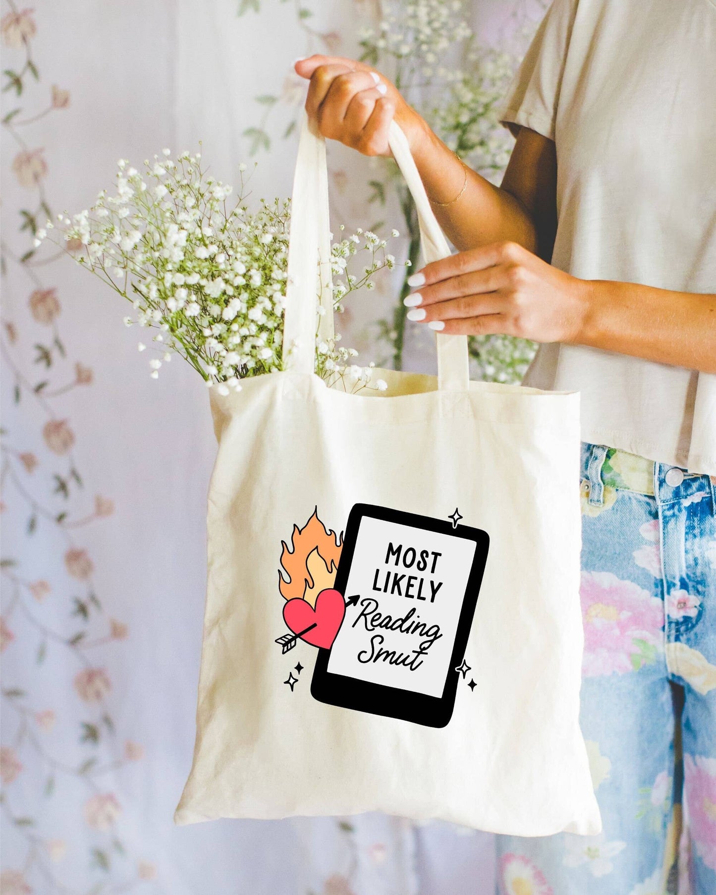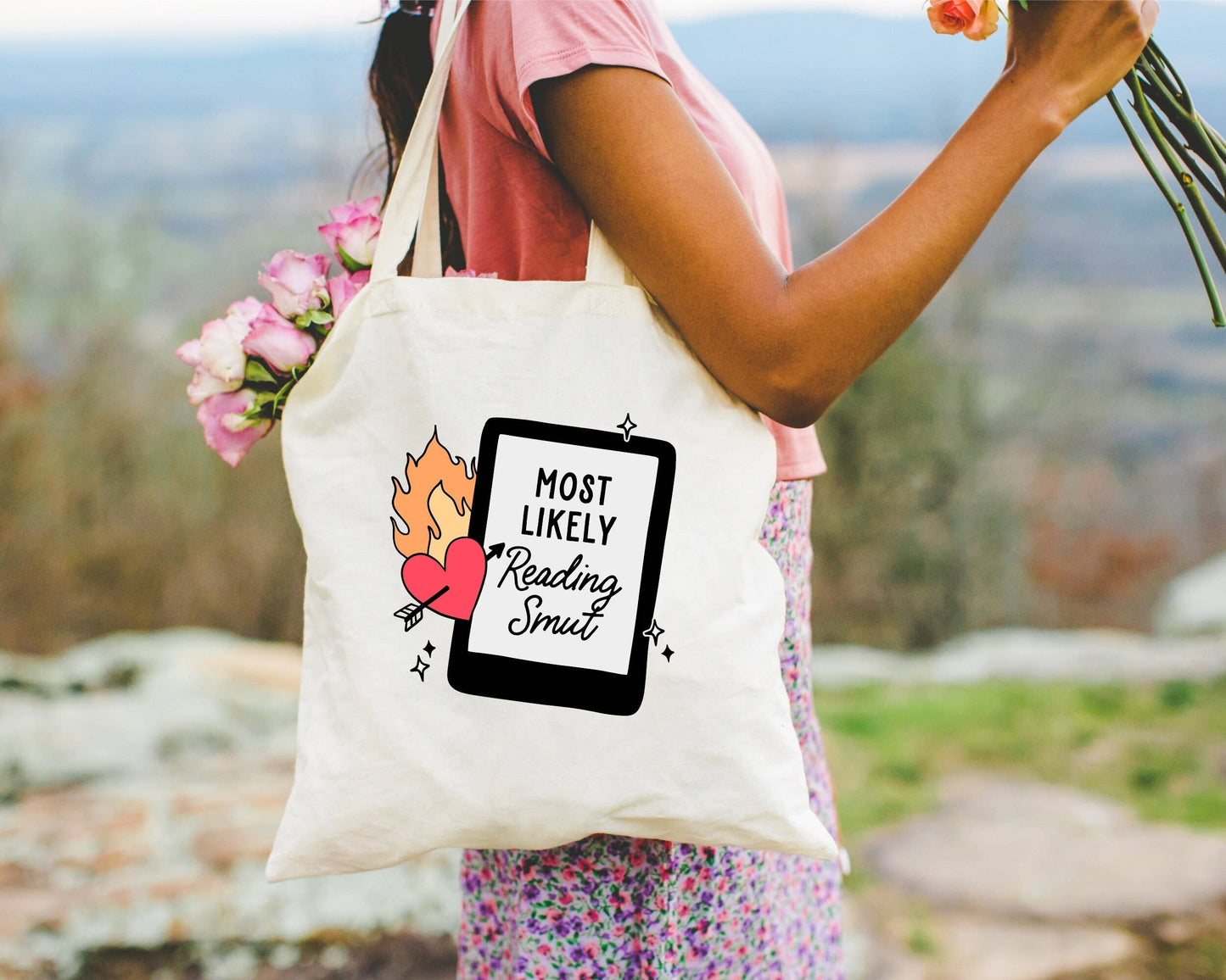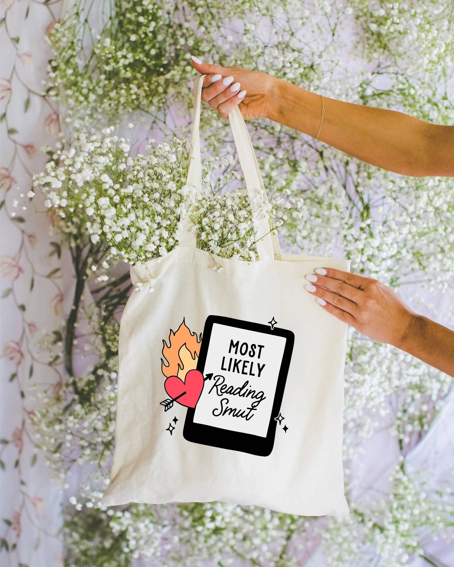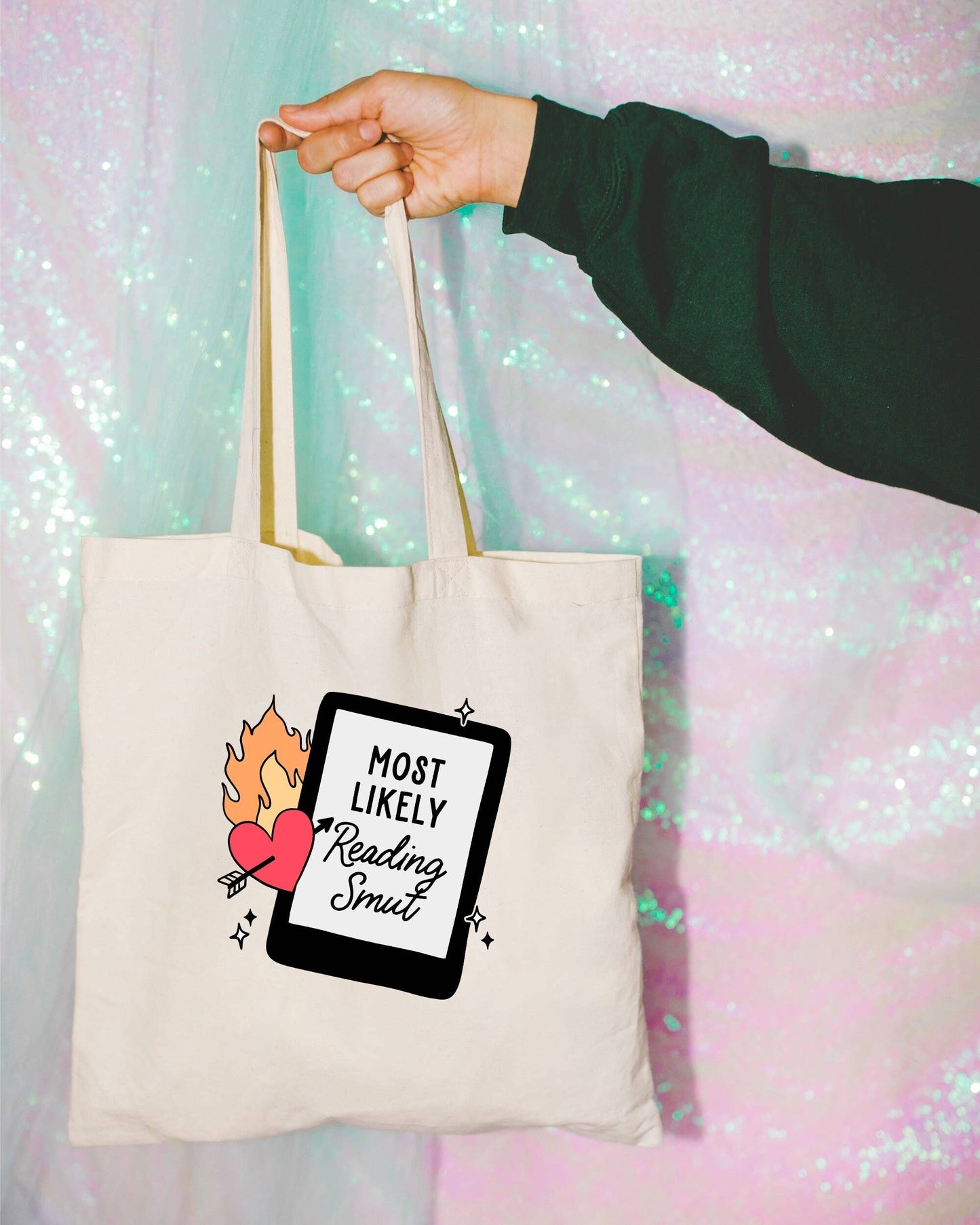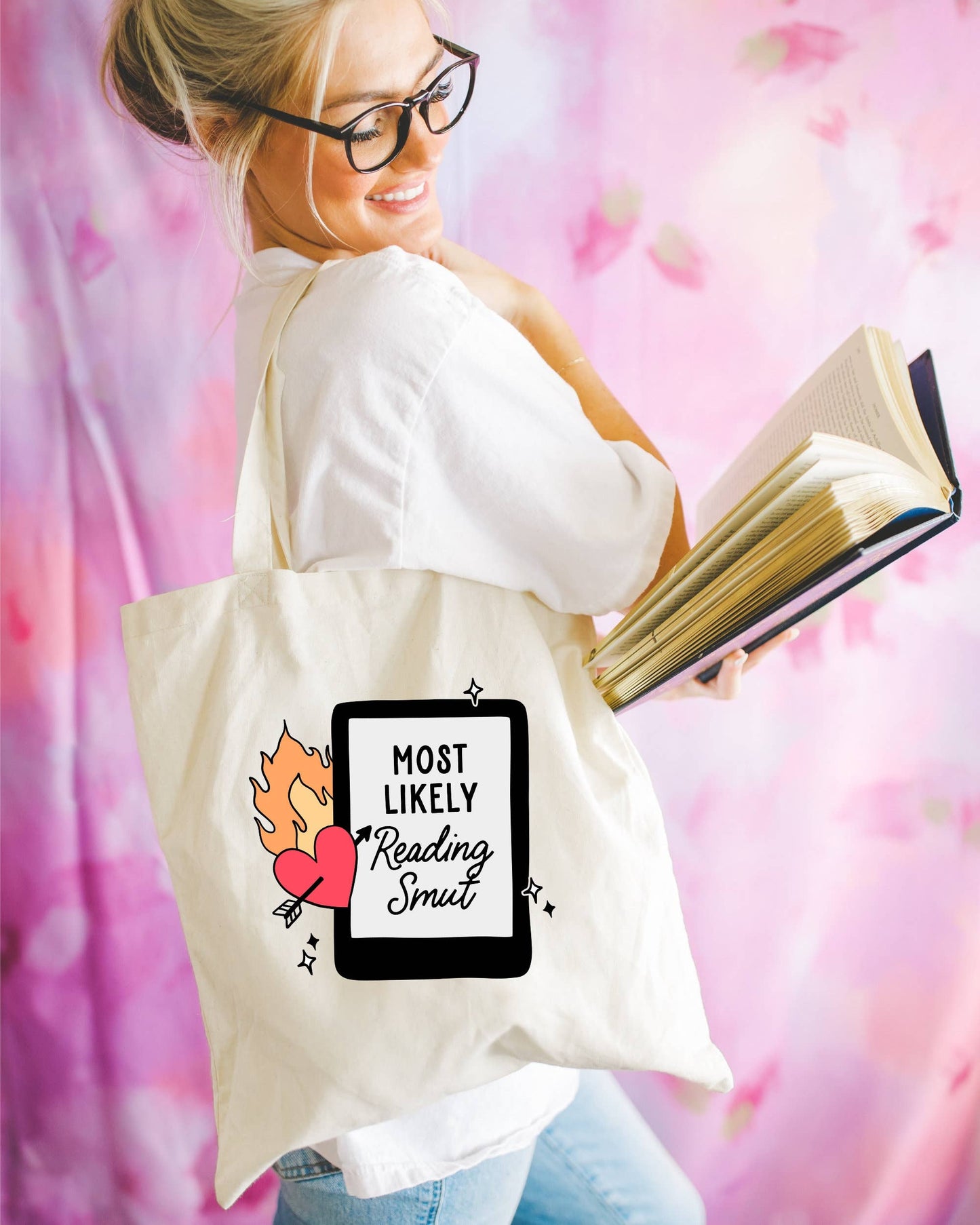 Laget av 100% bomullsduk får du denne gøyale og slitesterke handlenettet med teksten "Most likely reading smut".