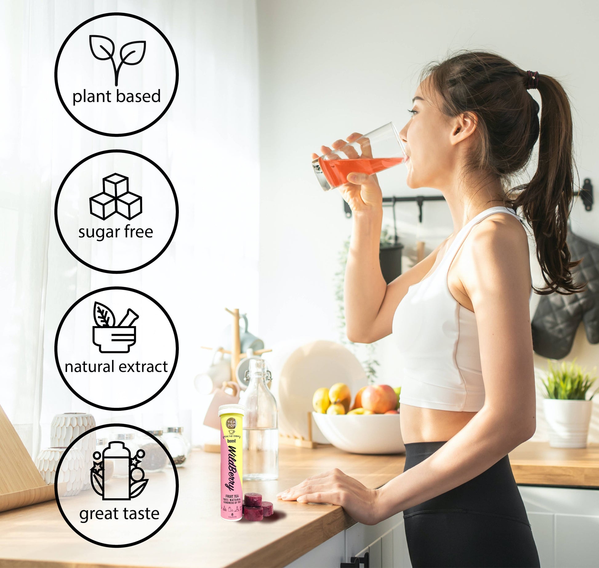 • Laget av 100 % naturlig te, frukt, planter og urter. • Løses helt opp i varmt og kaldt vann.