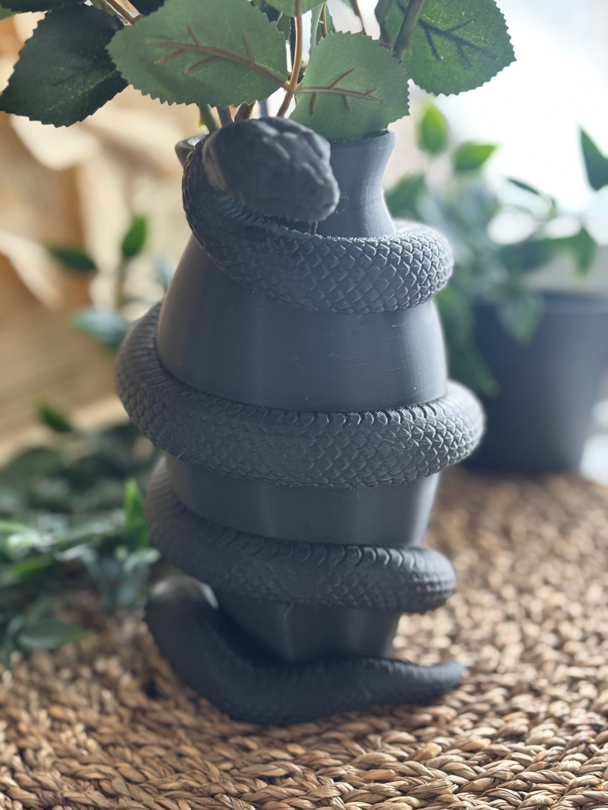 Denne 3D-printede vasen er dekorert med en detaljert slange som slynger seg elegant rundt formen, og gir et dramatisk og gotisk uttrykk. Perfekt som et blikkfang i bokhylla, på skrivebordet eller som en del av en mørk og magisk interiørstil.