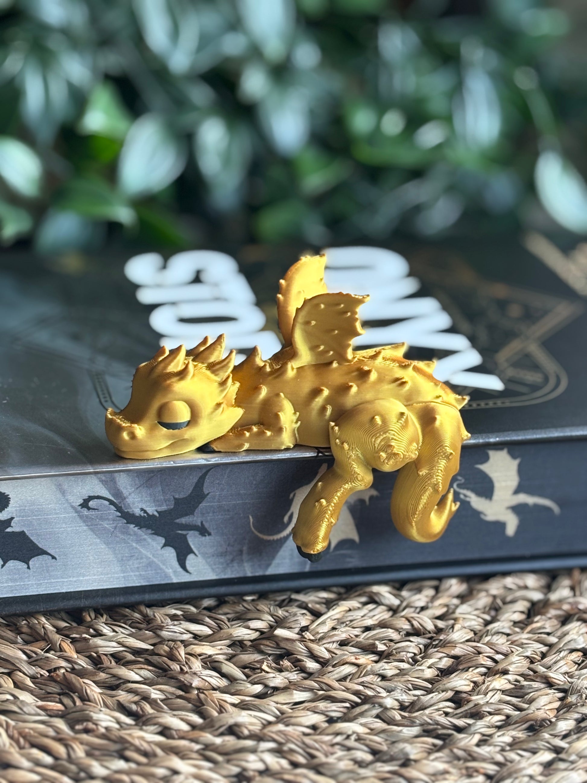Denne 3D-printede dragen hviler avslappet over kanten og gir et lekent, koselig uttrykk til bokhylla eller skrivebordet ditt. Med fine strukturer, myke former og et rolig utseende passer den perfekt for bokelskere, fantasy-fans og samlere. Dragen er lett, solid og designet for å bli et lite blikkfang – enten alene eller sammen med bøker og andre dekorfigurer.