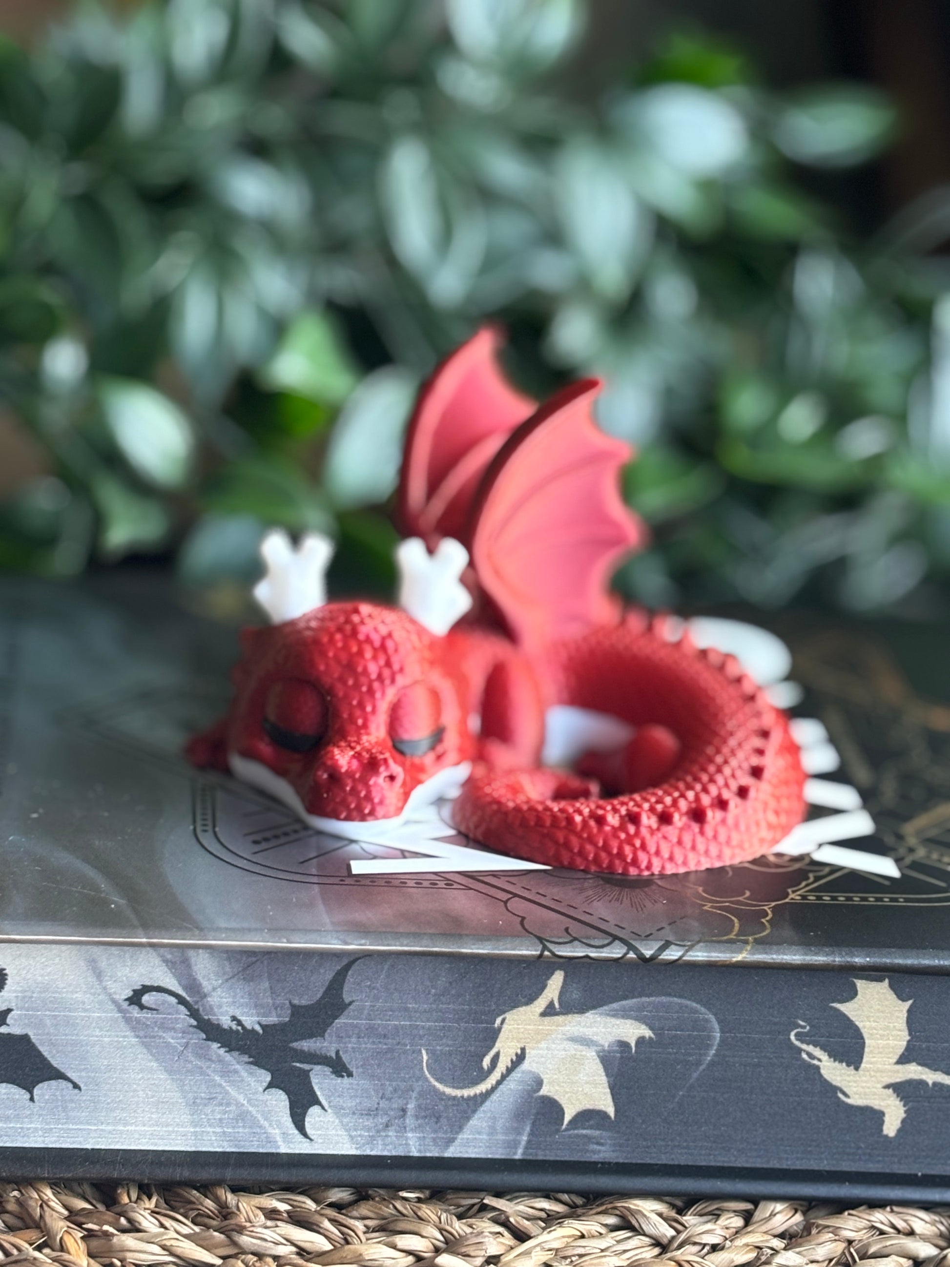 Denne søte, 3D-printede dragen ligger rolig sammenkrøllet og passer perfekt som dekor på bokhyller, skrivebord eller nattbord. Med fine detaljer, myke former og et uttrykk som gir en følelse av ro og fantasi, er den et ideelt tilskudd for bokelskere, fantasy-fans og samlere. Dragen er lett, solid og 3D printet i PLA – en liten magisk følgesvenn som gir liv til hylla di.