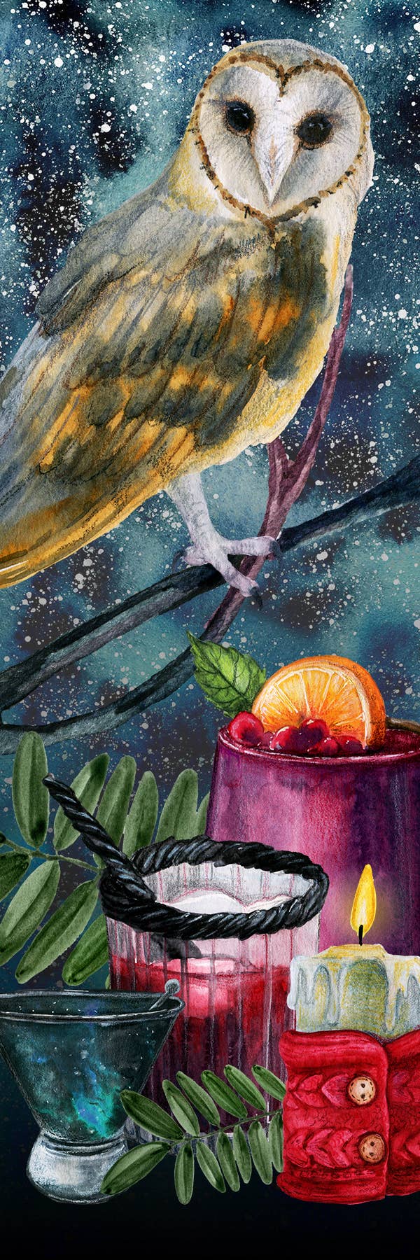 This spooky owl is sitting near a nice-looking cocktail. Or a magical potion!