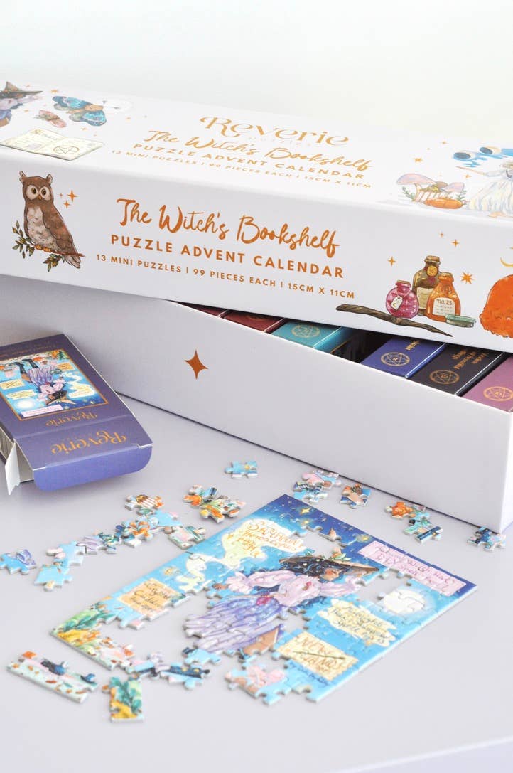 Denne Halloween-nedtellingskalenderen består av 13 mini-puslespill som etterligner den typen bøker du ville sett i en hekses bokhylle – fra lærebøker til blader, kokebøker og til og med en YA-roman! Hver drømmende illustrasjon er også paret med et sammendrag av «boken» for å gi en endre bedre bokhylleopplevelse!