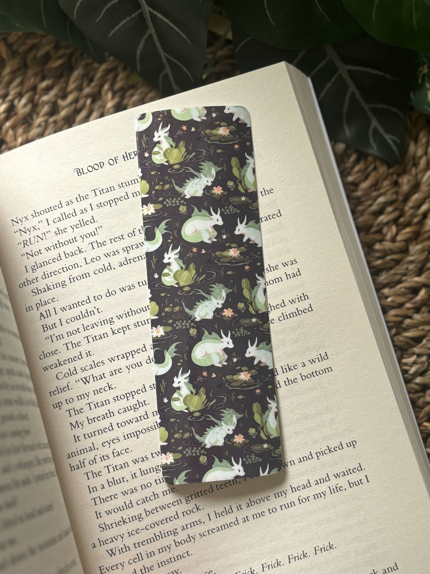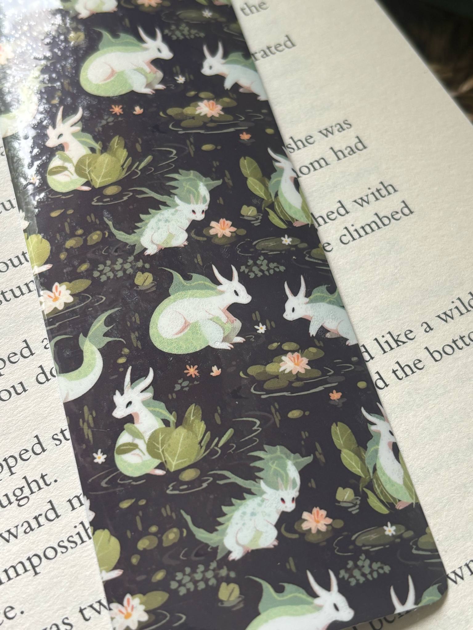 Små, hvite drager leker blant vannliljer og blomster på dette sjarmerende bokmerket. En perfekt gave til deg selv eller noen som elsker søte detaljer og et hint av fantasi i lesestunden.