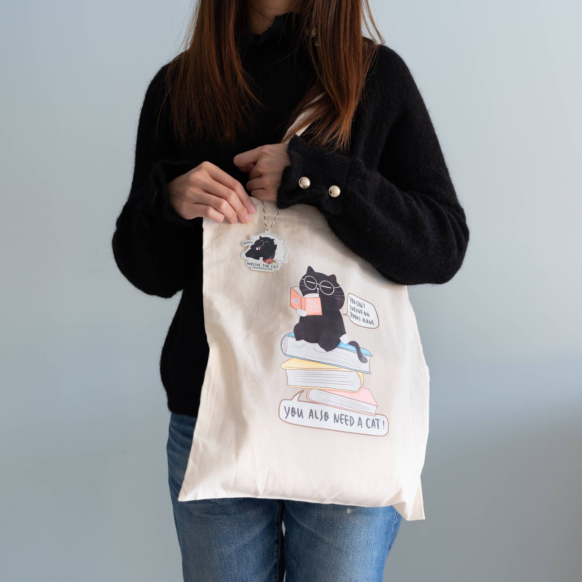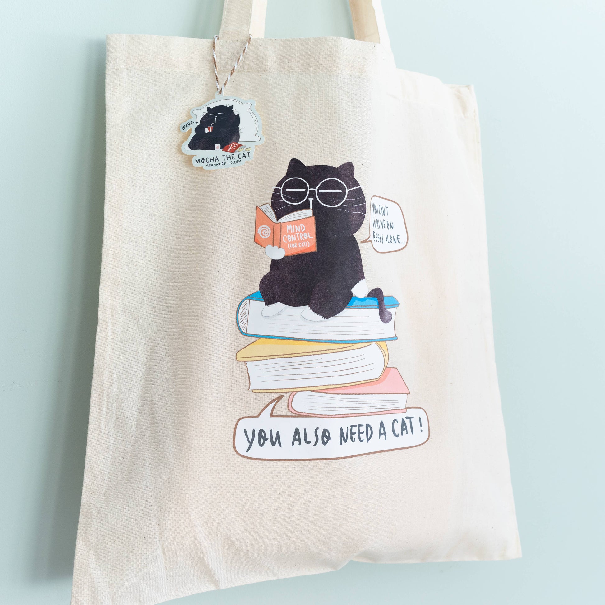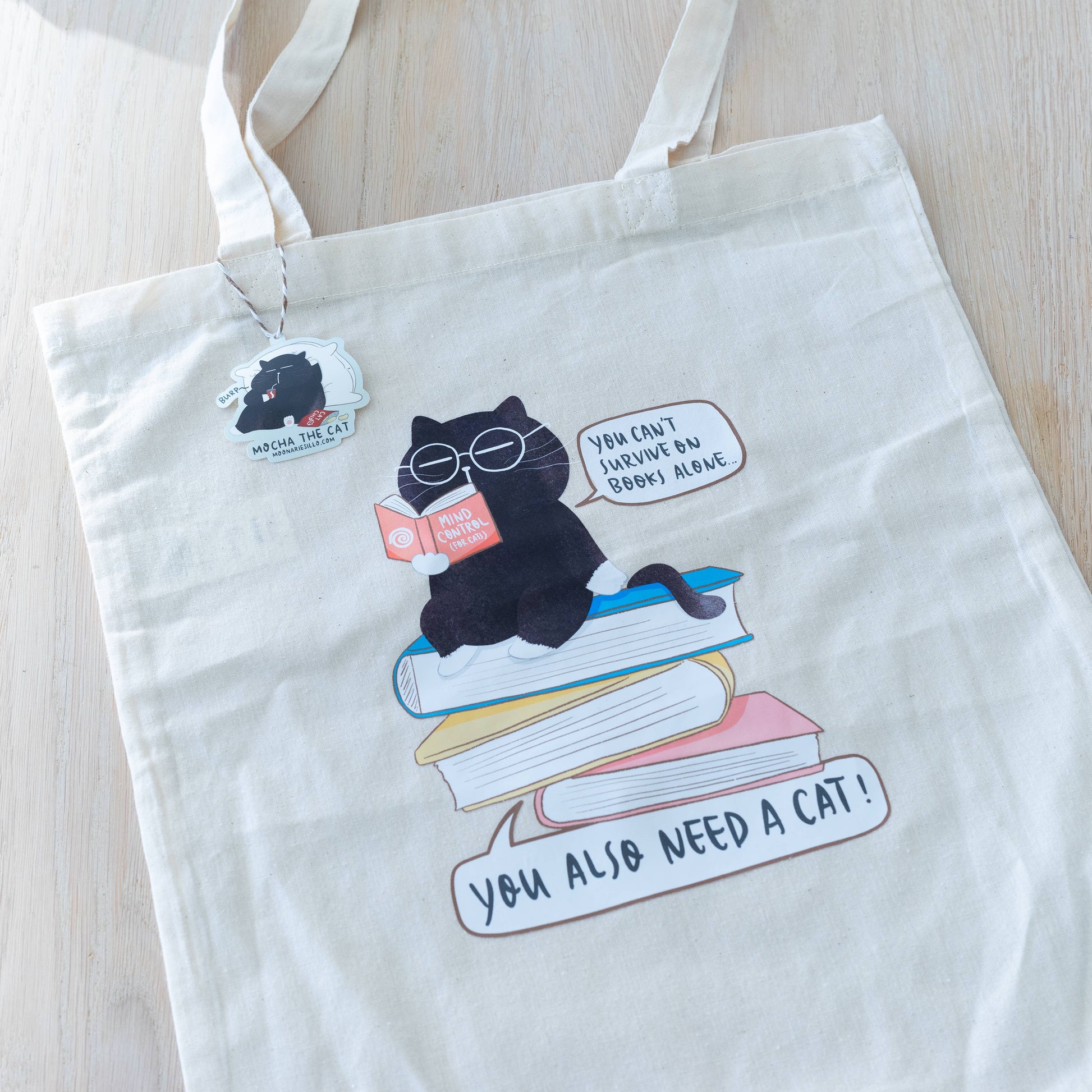 Mocha cat knows the secret to a balanced life—books and cats! This tote bag features Mocha sitting on a stack of books, engrossed in his current read, "Mind Control (for Cats)." The playful caption reminds us that while books are essential, no library (or life) is complete without a cat by your side. This bag is purrfect for bookworms and cat lovers who understand the magic of both!